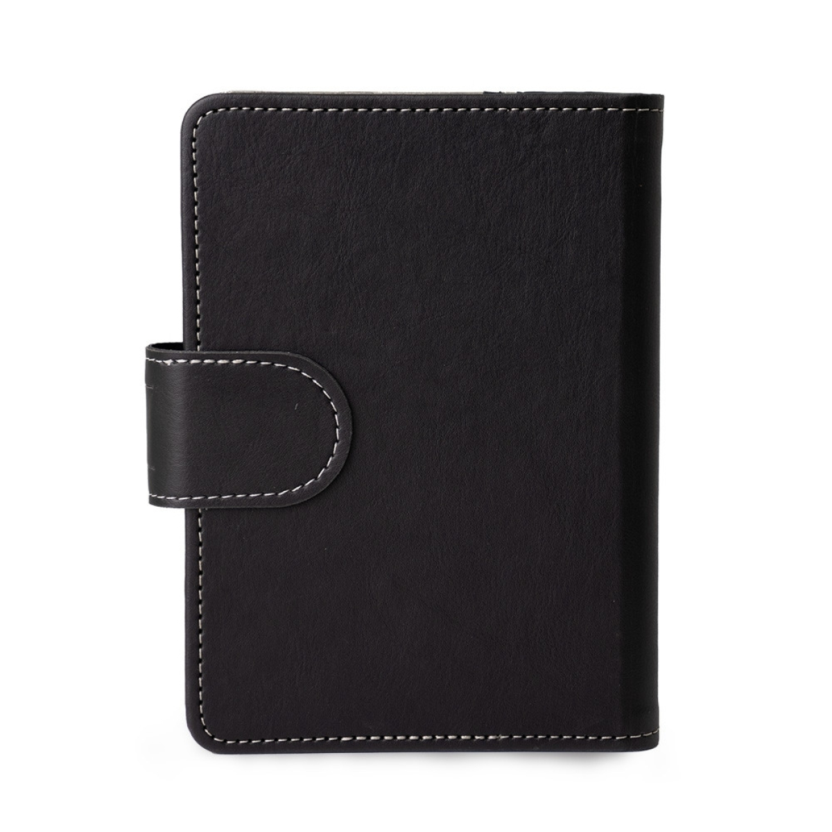 Descrição: Caderneta de couro sintético com fechamento de botão. Possui caderno capa dura em couro sintético com aproximadamente 100 folhas pautadas, divisórias para cartões e bolso lateral.