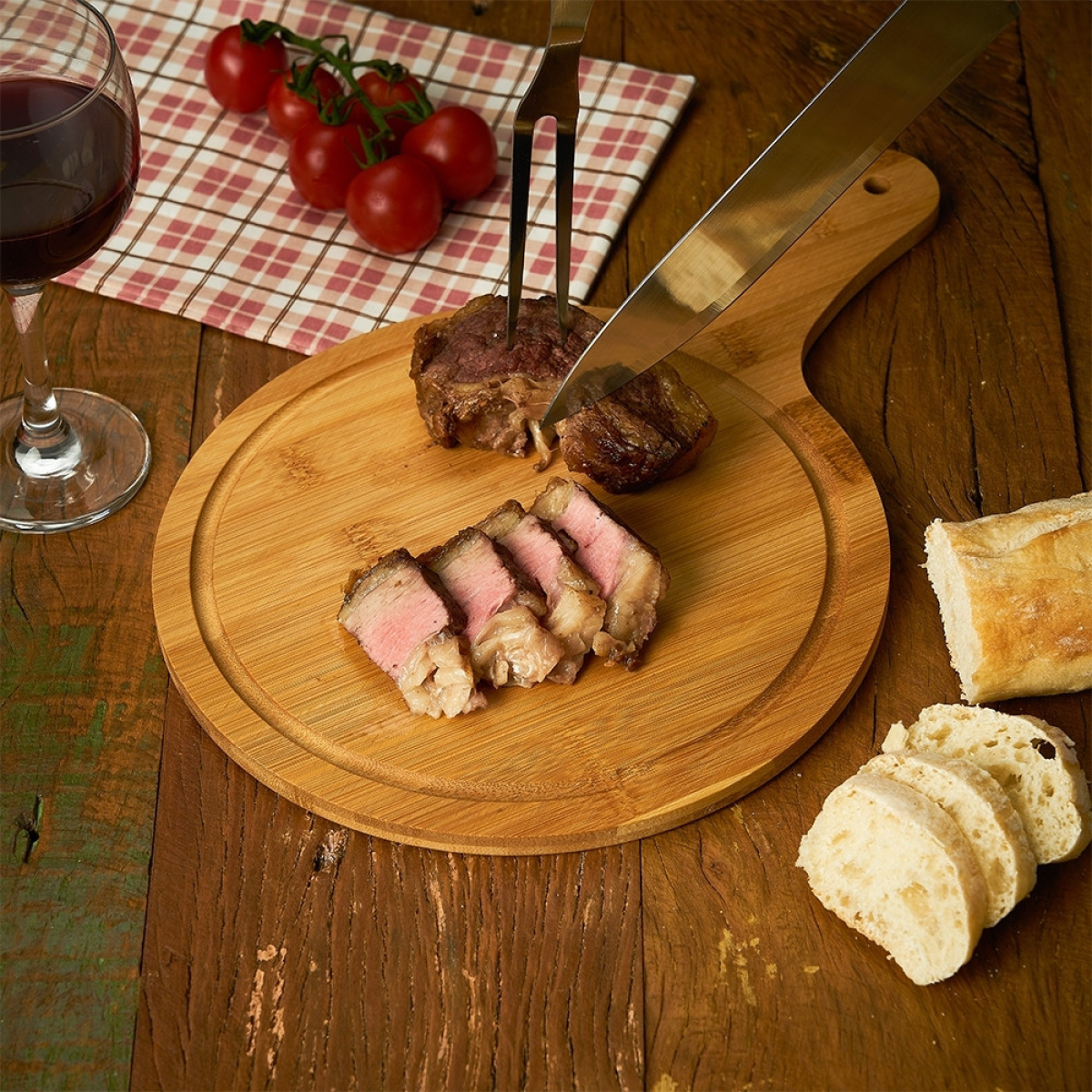Descrição: Tábua de bambu média com canaleta e cabo.