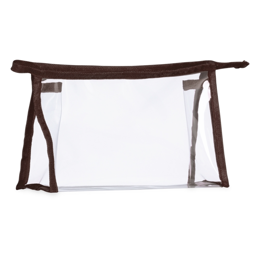 Descrição: Necessaire plástica transparente com detalhe colorido em nylon.